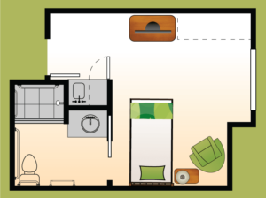 Our floor plan is designed to meet the special requirements of our residents and create a comfortable living environment. Each suite comes equipped with a wardrobe/closet, a 3-drawer chest, and a kitchenette. We encourage you to bring in the special touches that will remind your loved one of home.